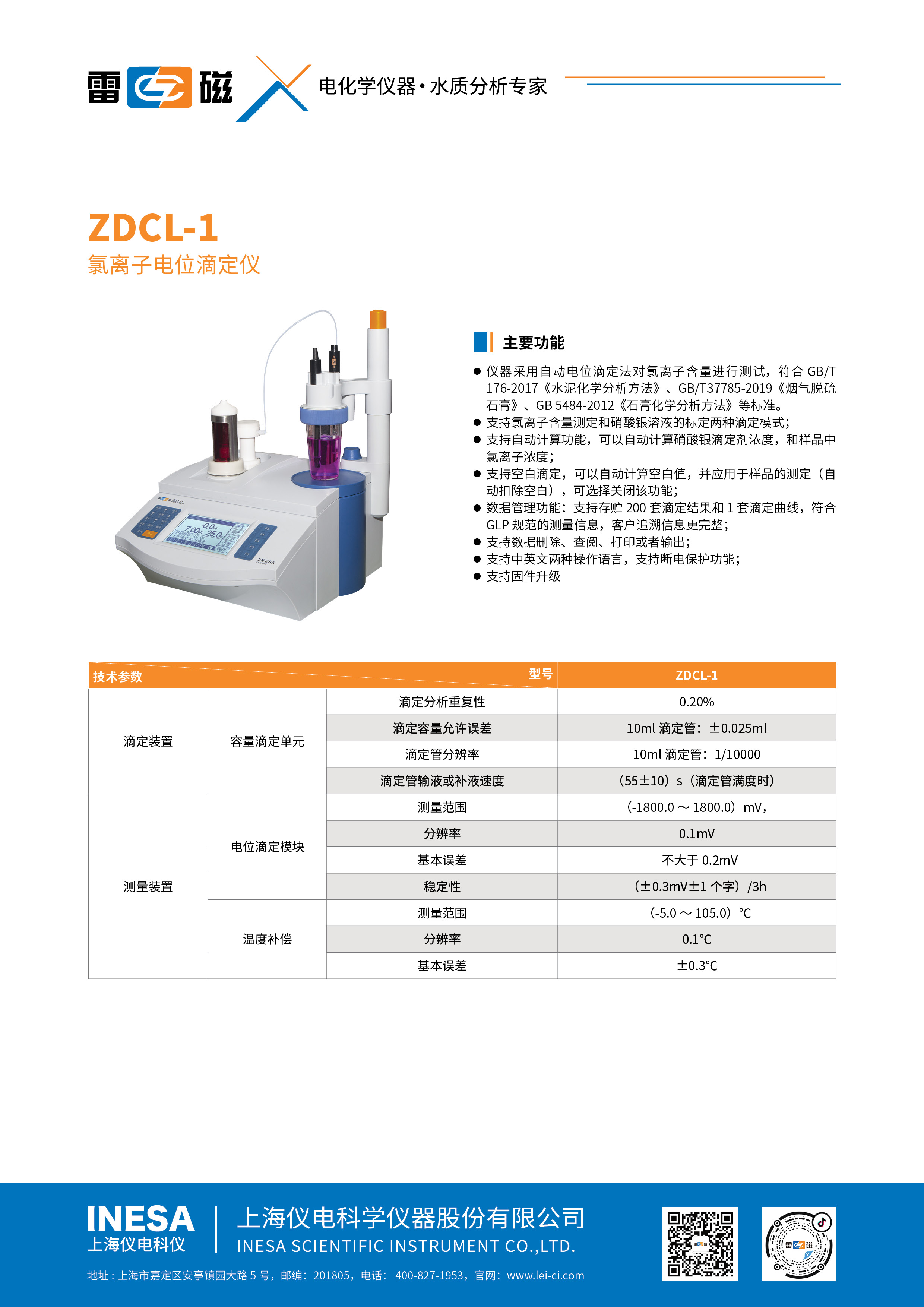 ZDCL-1 型氯离子自动电位滴定仪主机、pCl-1-01型氯离子电极,217-01型参比电极,滴定管10ml, 水泥氯离子含量成分分析标准样品
