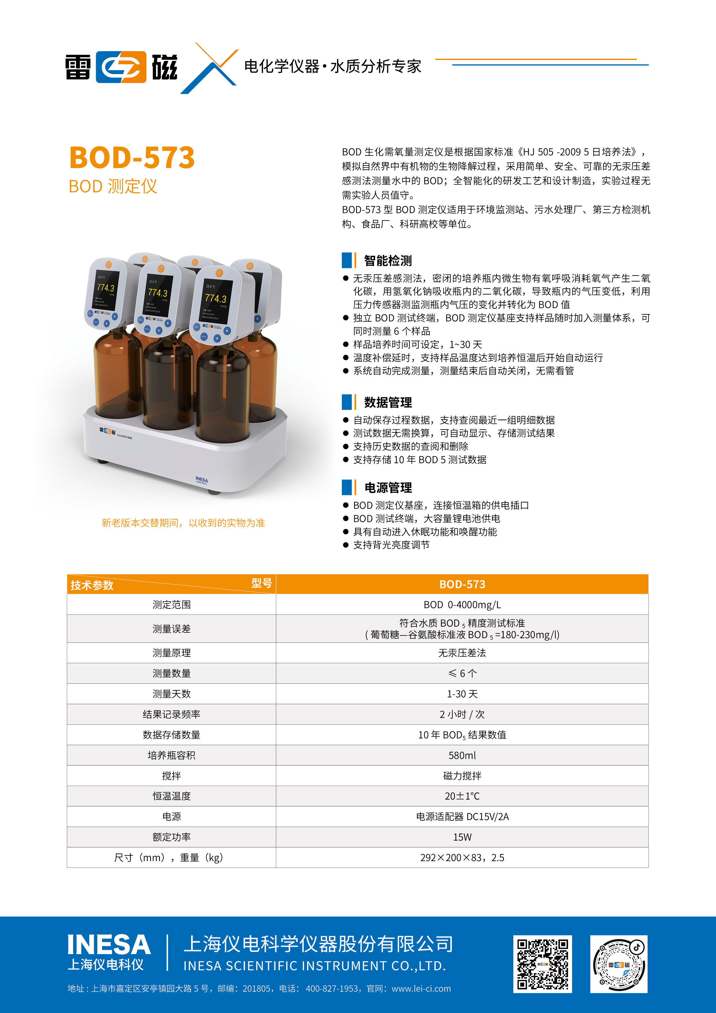 ● 采用无汞压差感测法,测试水体中的 BOD 浓度。