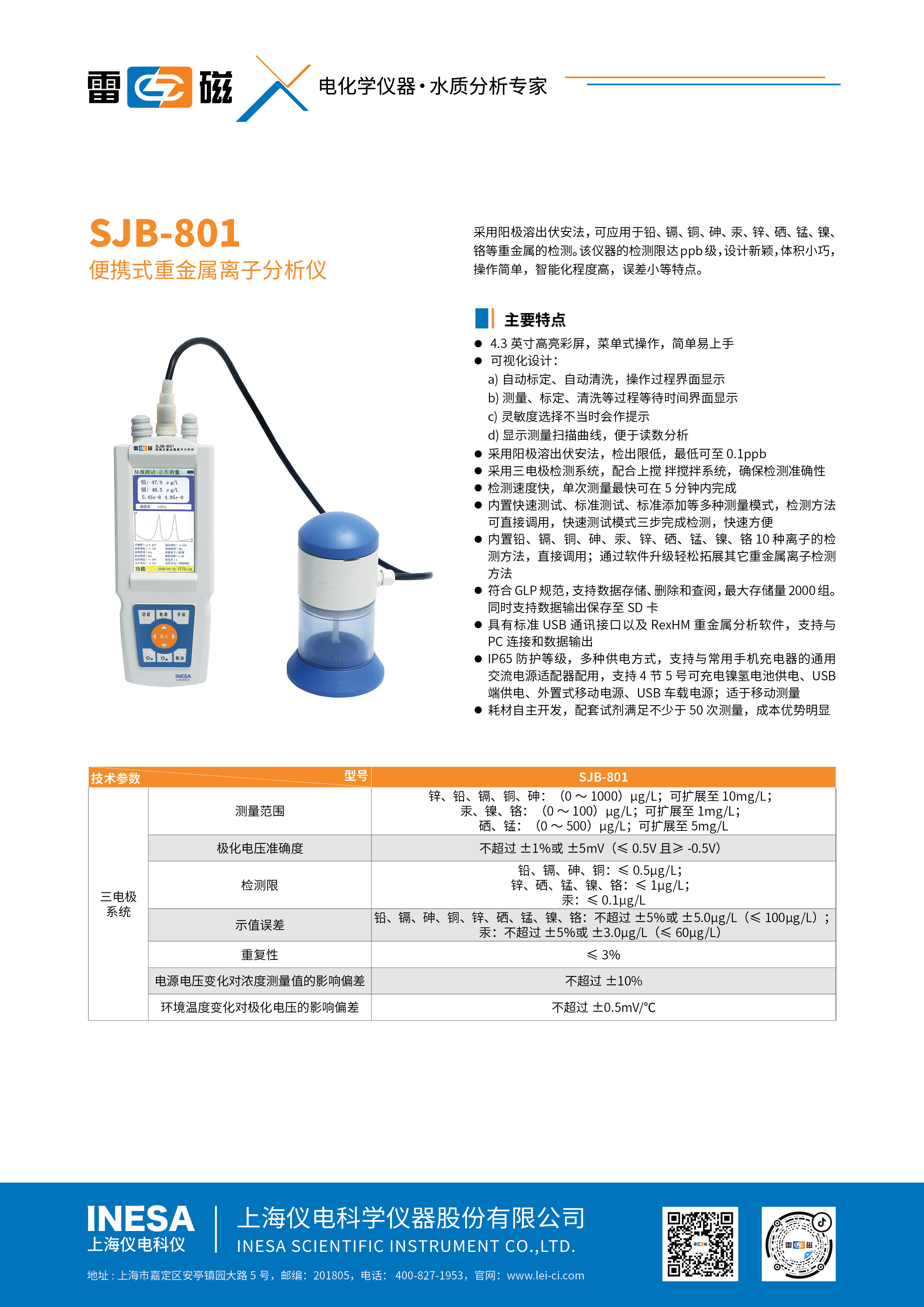 测量范围 | 锌:(0~100)μg/L,(100~500)μg/L,(500~1000)μg/L;可扩展至10mg/L 镉:(0~100)μg/L,(100~500)μg/L,(500~1000)μg/L;可扩展至10mg/L 铅:(0~100)μg/L,(100~500)μg/L,(500~1000)μg/L;可扩展至10mg/L 铜:(0~100)μg/L,(100~500)μg/L,(500~1000)μg/L;可扩展至10mg/L 砷:(0~100)μg/L,(100~500)μg/L,(500~1000)μg/L;可扩展至10mg/L 汞:(0~10)μg/L,(10~50)μg/L,(50~100)μg/L;可扩展至1mg/L |